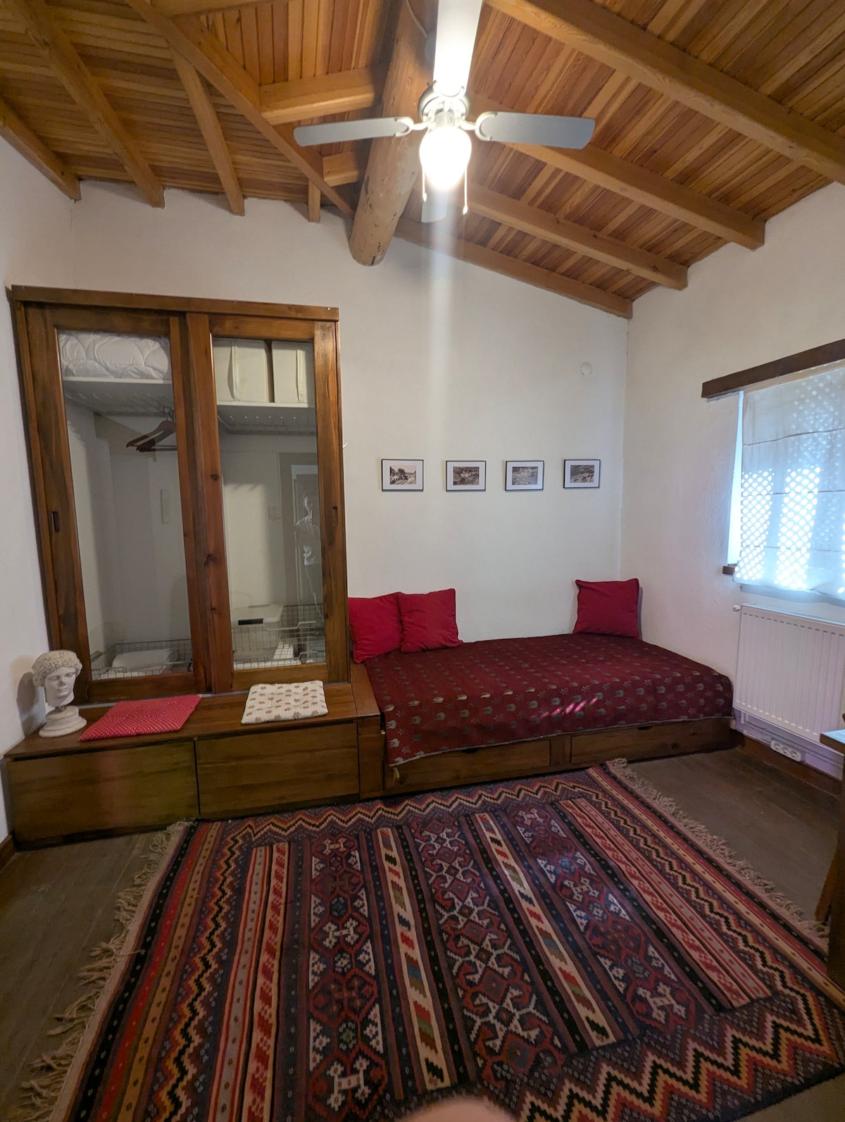 Hem merkeze çok yakın hem de huzurlu ve sessiz bir sokakta yer alan bu küçük 1+0 taş evde bir yatak odası, küçük bir mutfak alanı, tuvalet, banyo bulunur. Şirince şaraplarıyla ünlü güzel bir köydür ve yolların tamamı köy dokusuna göre taşlarla kaplıdır. Sezonda oldukça yoğundur bu sebeple aracınızı ücretli otoparka park etmeniz ve eve yürüyerek ulaşmanız gerekebilir. Eve yürürken iki farklı yol vardır; birinde oldukça dik bir yokuş bulunur, diğer yol az eğimlidir.