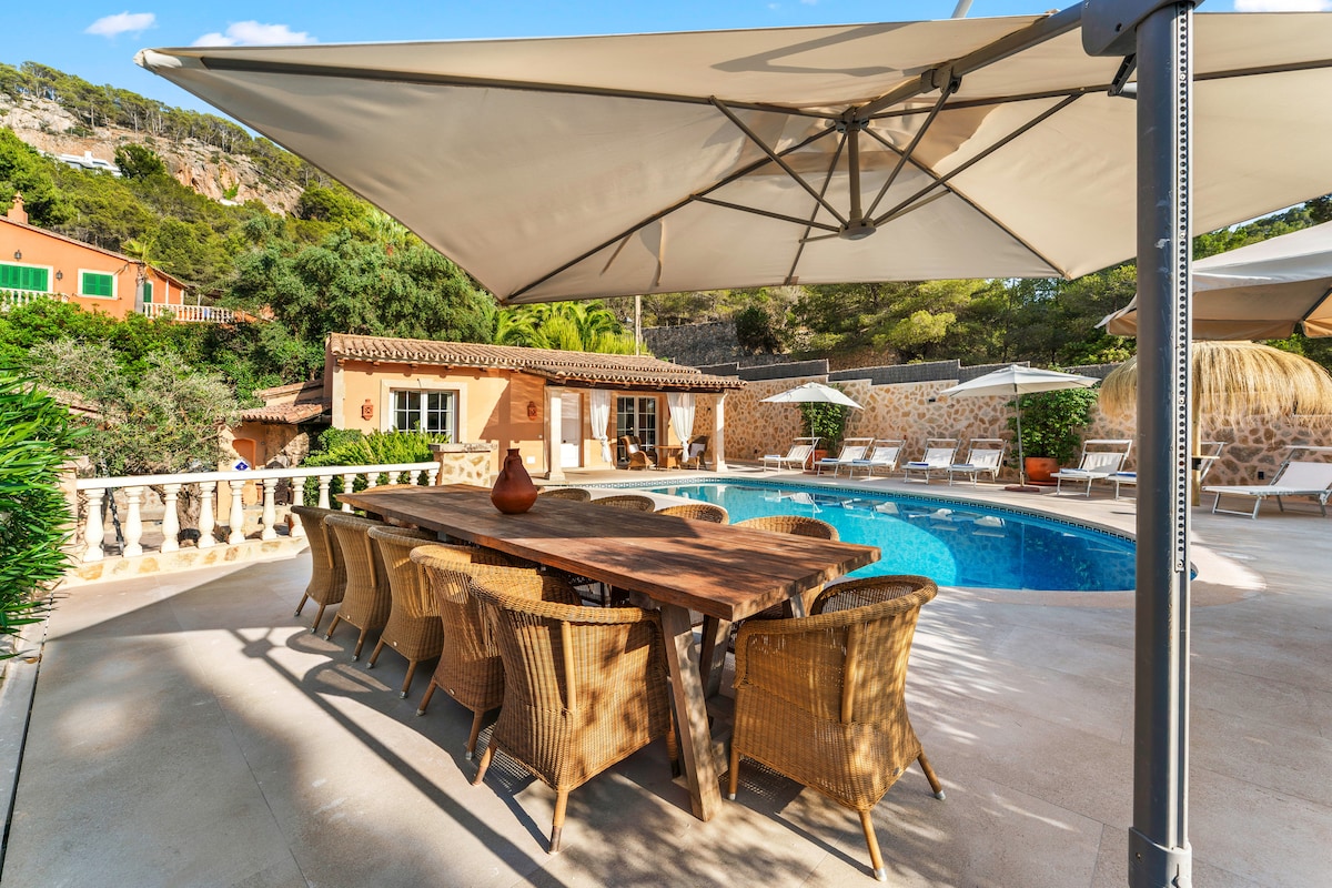 Nuestra encantadora casa de campo ha sido recientemente remodelada, equipada con todas las comodidades de lujo y decorada con buen gusto. La casa se encuentra en S’Arraco (justo entre Andratx y San Telmo) y tiene vistas a las hermosas montañas de Tramuntana. El corto trayecto en auto desde la carretera hasta la casa es una pequeña pieza no demasiado estrecha, pero con curvas y un poco áspera, pero no difícil de conducir. Nuestra piscina está de 5 a 10 m.
