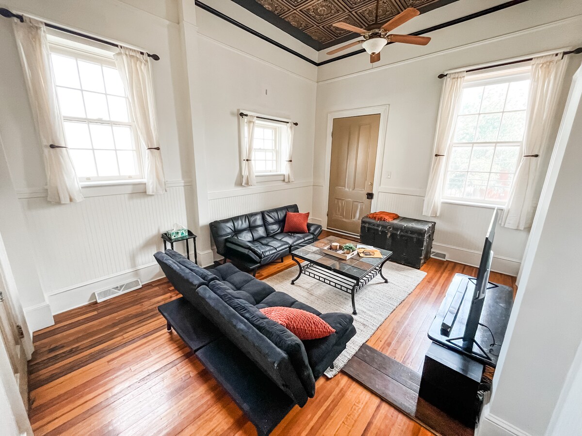 Disfruta de una experiencia con estilo en esta mansión histórica reformada con una ubicación céntrica. El Don Quijote incluye todo el nivel principal de The Gilliam House; la renovación de la propiedad recibió un Premio al Mérito de la Sociedad Histórica de Lynchburg en 2012. Además de sus dos dormitorios grandes y cocina completa, el espacio incluye balcones exteriores que ofrecen vistas panorámicas del centro de Lynchburg. Las características adicionales incluyen: dos camas tamaño king, tres televisores, ventanas de 11' y suelos de roble originales.