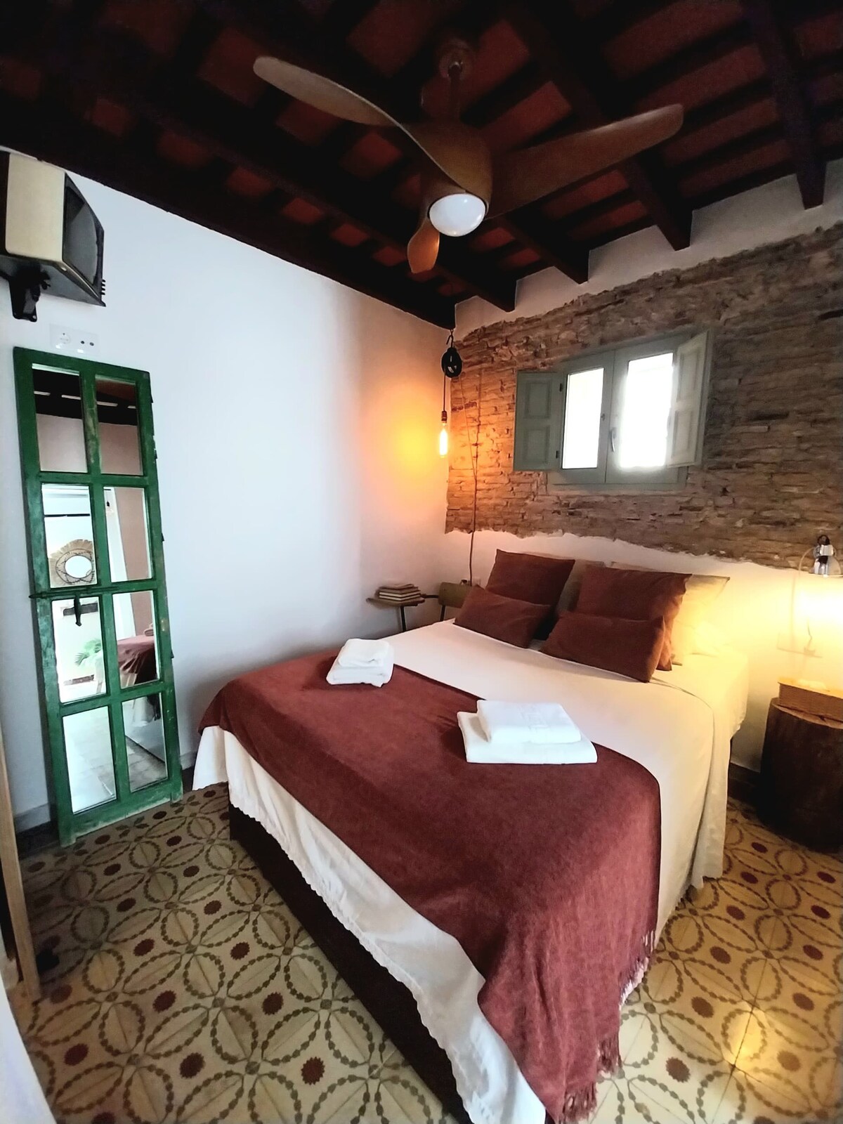 Disfruta de una experiencia única en este alojamiento en el centro de Jerez. Se trata de un estudio situado en la segunda planta de una casa antigua sin ascensor. Tiene ventanas al exterior, desde las que se ve la Catedral de Jerez, con paredes de piedra recuperadas de la construcción original del siglo XVIII y con una cuidada decoración. Dispone de un gran espacio en el que encontramos la cama, un lugar de estudio y una mesa de comedor, además, dispone de cocina completamente equipada.