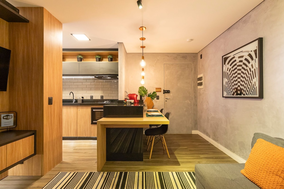 ¡Experimenta comodidad y practicidad! Hemos preparado un apartamento moderno, amueblado con gran cariño para tu estadía. ¡Te sentirás en casa! Ambiente acogedor con: Cocina completa, balcón soleado, cama doble con armario, Smart TV, Wi-Fi, aire acondicionado y ropa de cama/baño nueva y suave. Y más: además de un encantador estudio y ocio en el condominio, estarás en una ubicación privilegiada, cerca del Bosque de Jequitibás, Av. Norte-Sul y Cambuí, con excelentes restaurantes y cafés.