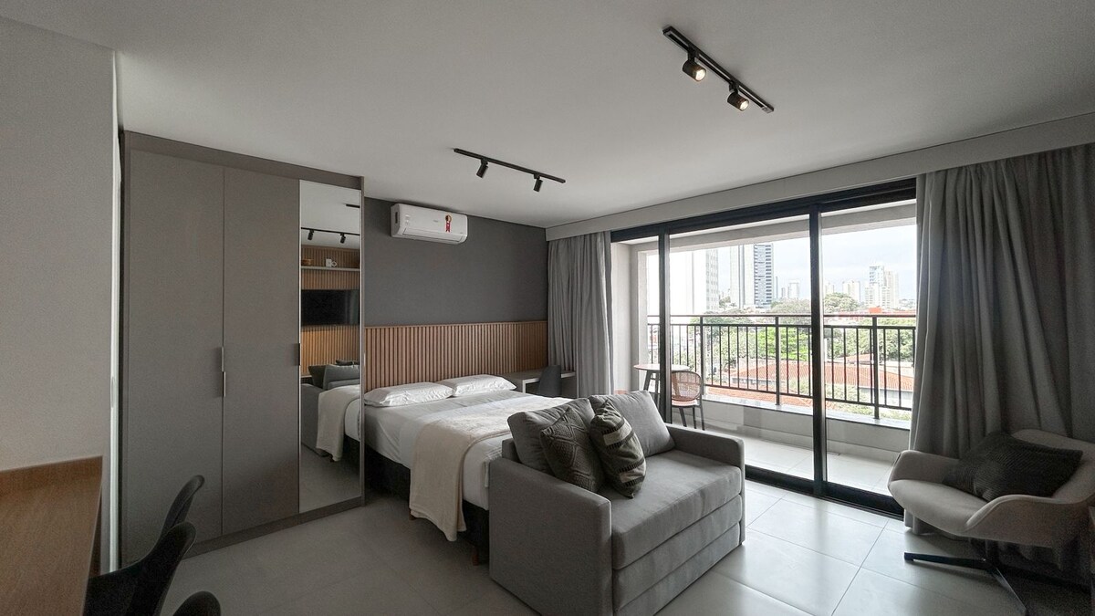 Estudio loft de 32 m² en condominio con decoración de alta gama, diseñado para que nuestros huéspedes se sientan como en casa, aire acondicionado, aire acondicionado, ambiente con aire acondicionado ¡Espacio ideal para personas que viajan solas y parejas! Hospedamos hasta 2 huéspedes con comodidad y seguridad, ofrecemos cuna para niños de hasta dos años; El ambiente es moderno, completo con todo lo necesario, suministramos enjoval completo, ven con la ropa solo el resto está con nosotros Wifi 7: alta velocidad y calidad