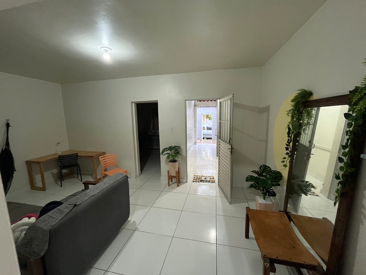 Nossa acomodação possui um quarto espaçoso e um banheiro. A sala é ampla e em conceito aberto, possuindo uma mesinha para jantar. A acomodação conta com uma rede para descanso no exterior da casa, curtindo a brisa do mar. Caso os hóspedes queiram se bronzear ou fazer um "happy hour" a dois ou três, a laje da casa de hóspedes é aberta a visitação. Disponibilizamos roupa de cama, entretanto, NÃO disponibilizamos roupas de banho (toalhas).