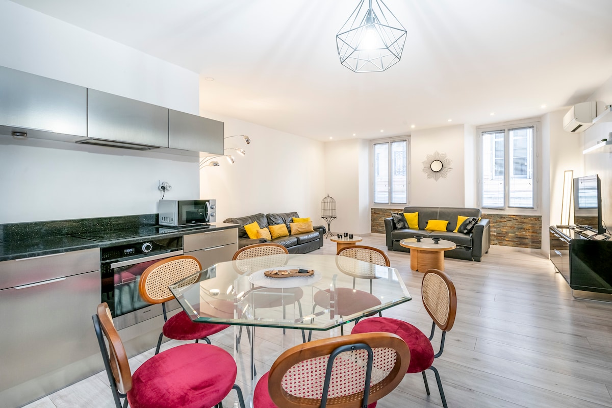 Centro de la ciudad, cerca del palacio de festivales, playas a pie, calles comerciales y peatonales. Muy tranquilo, tiendas de proximidad. Apartamento totalmente renovado, planta alta, 2 terrazas con vistas a las colinas y al mar, garaje grande, 2 dormitorios, 1 Seb, aseo independiente, aire acondicionado, cocina equipada nueva. Ideal para familias y congresistas... cerca de la estación de tren (a 10 minutos a pie)... Apartamento perfectamente adaptado para una familia con niños o congresistas que buscan dos dormitorios con dos camas grandes