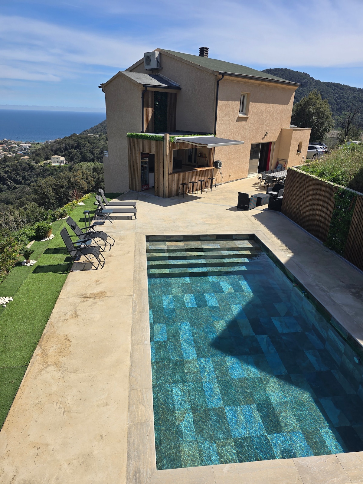Magnífica villa totalmente climatizada y con piscina, 200m de la magnífica playa de Sisco. La villa pone a su disposición varias terrazas que ofrecen impresionantes vistas al mar y a la montaña, garantizando absoluta calma y tranquilidad.Encontrará todo el equipamiento necesario para una estancia inolvidable con amigos o familiares. Disfrute de entretenimiento como una mesa de ping-pong, una canasta de baloncesto y pelotas de petanca a su disposición.
