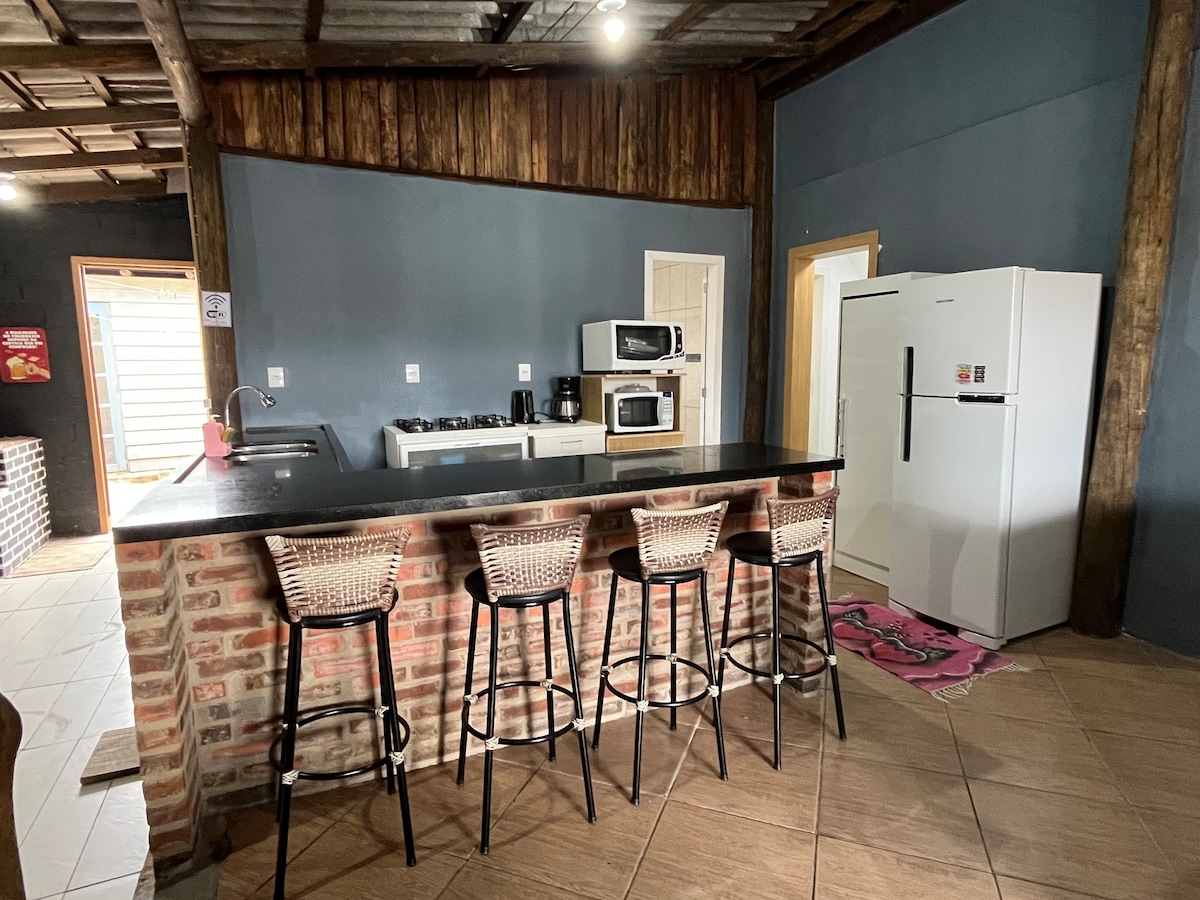 Amplia casa, patio de césped, delantero y trasero, chimenea y barbacoa interna, cocina integrada, baño grande, ducha al aire libre, casa con vigilancia y monitoreo, espaciosa, ideal para una familia de hasta 5 personas.