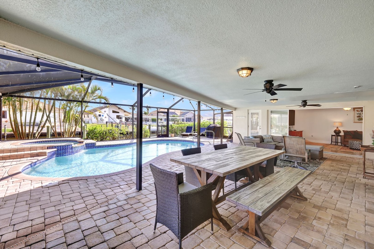 Location, Location Location! Quiet , 3 bed 2 Bath Home on a Canal with Private Lanai and Large Pool with a Jetted Spa! Fish from the dock, bring your own boat or rent one, or just hang out with Family and Friends. Walking distance to Popular Restaurants like Lobster Lady, Rumrunners, Fathoms and many more! Publix Grocery Store is within walking distance. Bike to Cape Harbor for concerts and dining. Open Concept Living, Dining and Family Room that all connect to Beautiful Lanai .