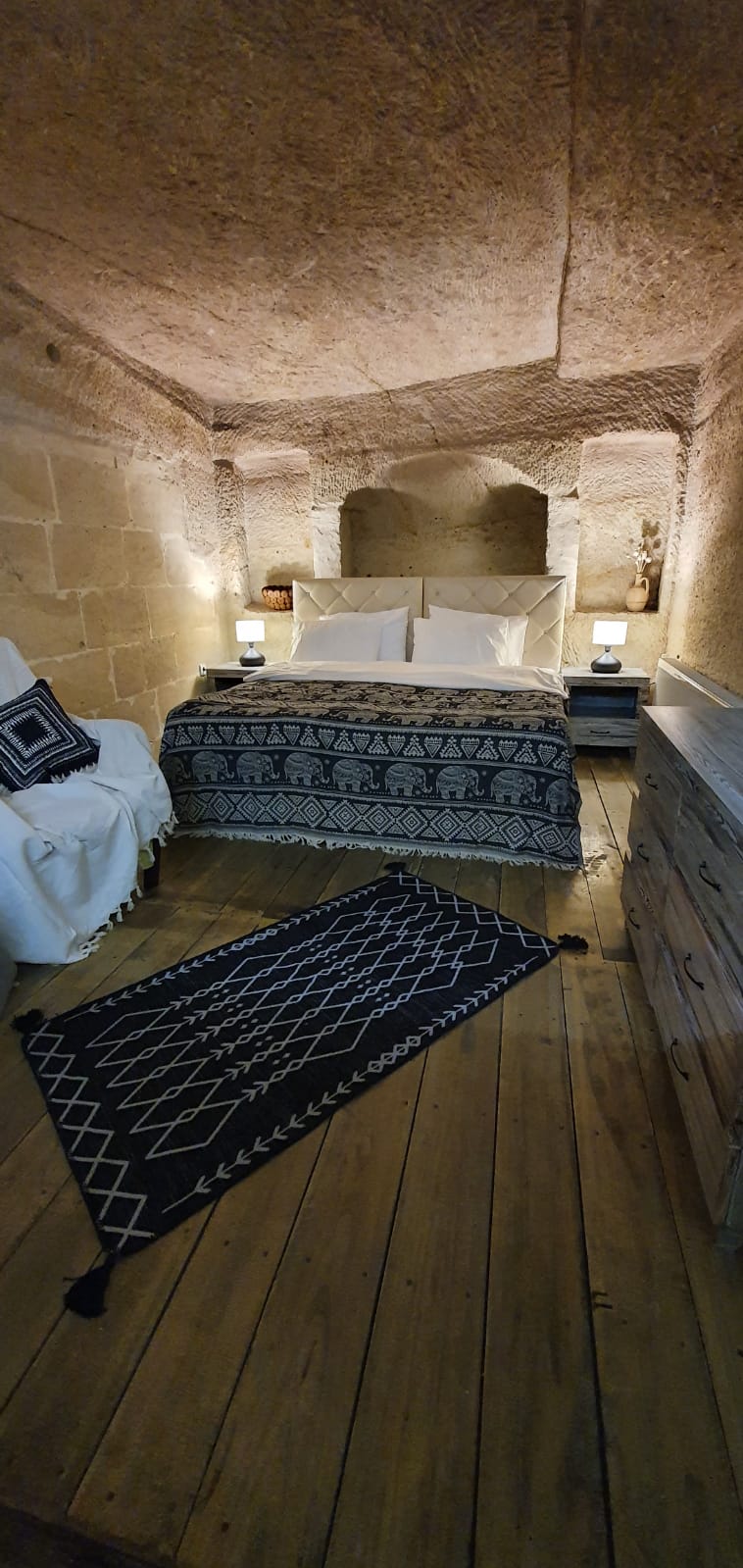 Inspired by a love for Turkish styling and the ease of modern design, our building contains 3 levels and two apartments. The upstairs stone apartment is light and airy, queen sized ensuite bedroom, spacious lounge with statement accents. Downstairs apartment is set inside a cave, with queen sized bedroom and a double shower/sink. Both apartments have fully self contained kitchen/dinning area, and a terrace. Perfect for outdoor dining & soaking up the village atmosphere after enjoying Cappadocia.