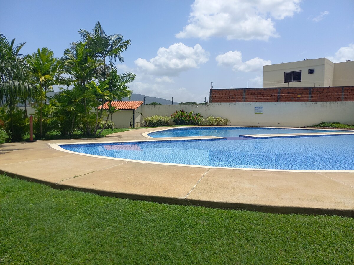 Residencia cerrada con vigilancia, comunidad tranquila y familiar; ubicada en la zona norte de Valencia, cerca del CC Sambil, supermercado Kromi, Seca Sport, Parque Dunas y Hotel Hesperia. Apartamento cómodo, 3 habitaciones, todas con aire acondicionado, sabanas, cobija y toallas. Sala-comedor con aire acondicionado, TV y hermosa vista de montaña. Cocina equipada, Wifi de alta velocidad. Pozo. 2 estacionamientos Camineras, piscina, parque infantil y cancha de básquet. Un oasis en la ciudad !