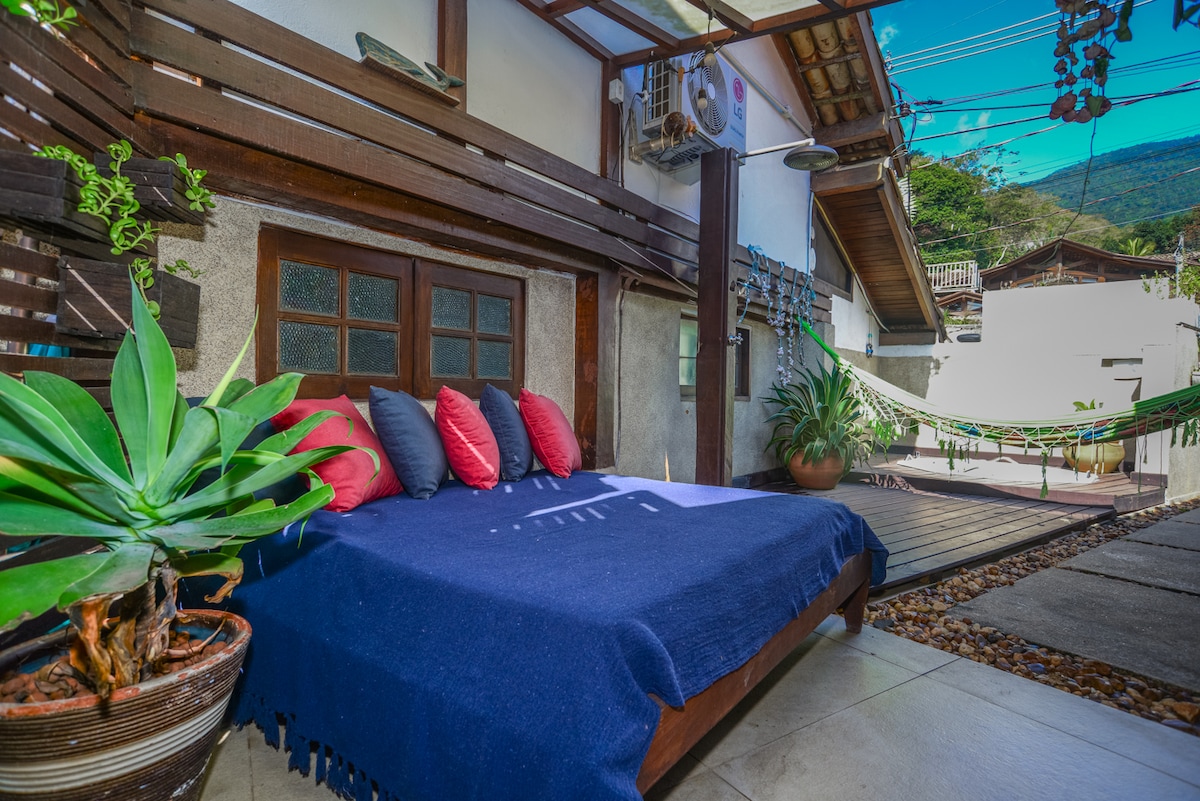 In front of one of the most beautiful and trendy beaches of Ilhabela, perfect for those who like to sleep listening to waterfall sounds and waking up with singing birds. Simple, cozy and equipped to provide a comfortable and unforgettable stay. It has air conditioning,TV,ceiling fan,electric shower with stall,refrigerator,electric oven,sink,microwave,coffee machine, sink, etc. In the garden and a private deck under the treetops, at the height of the wall, with beautiful sea views.