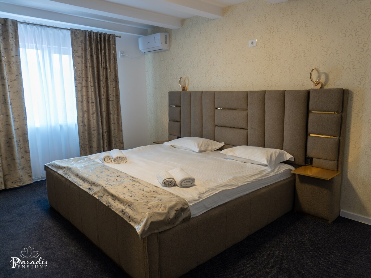 Habitación luminosa y acogedora, ideal para dos personas, equipada con una cómoda cama doble de 180×200 cm o 200×200 cm, muebles modernos y baño privado con ducha. La decoración es sencilla y relajante, diseñada para la comodidad y el descanso. La habitación está ubicada en el edificio principal de la casa de huéspedes, con fácil acceso al restaurante, a la piscina y a la zona de relajación.