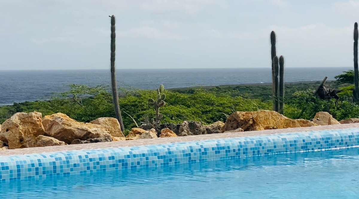 Take a break and unwind at this peaceful oasis.Sea – View private apartment with its own entrance Picturesque ocean- in the most prestigious neighborhood on the island of Bonaire. As you enter this property you will feel and see the sea, ocean and all tranquility that goes with that feeling and a spectacular view of the Caribbean Sea, island of Klein Bonaire, garden with tropical fruits trees mangoes, banana and palm. You can see a spectacular view from your private Balcony.