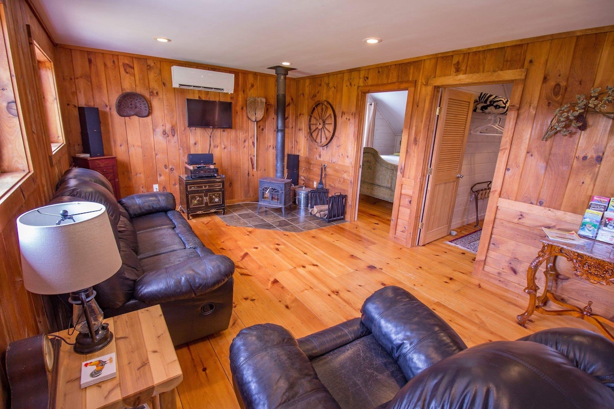Amplia sala de postes de segundo piso y vigas adornada con cama king, cocina completa, baño, sala de estar y lavandería. La casa de huéspedes se encuentra en 40 acres de naturaleza salvaje con vistas a las montañas y senderos para caminar en la propiedad. A solo dos millas del Stone Mountain Arts Center, a 15 minutos del pueblo de Fryeburg y a solo 25 minutos del vecino North Conway, NH. Un gran retiro para todas las estaciones. TV, Internet de alta velocidad, aire acondicionado, calefacción, ventiladores de techo, nueva construcción.