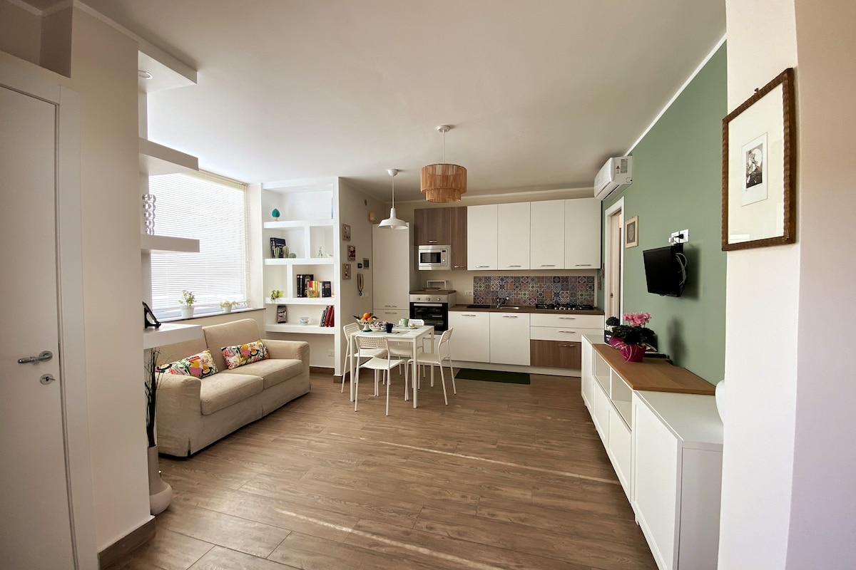 Appartamento al piano terra con piccolo giardino e posto auto riservato. Appartamento molto luminoso,circa 60 mq, con aria condizionata, riscaldamento, 2 tv, wifi ed infissi con zanzariera. Il living arredato con comodo divano letto, smart tv con abbonamento a netflix e tavolo da pranzo. La camera da letto matrimoniale è ampia e confortevole. Bagno con grande zona doccia. Cucina con piano snack, forno elettrico, forno a microonde, macchina da caffè, accessoriata con stoviglie e utensili.