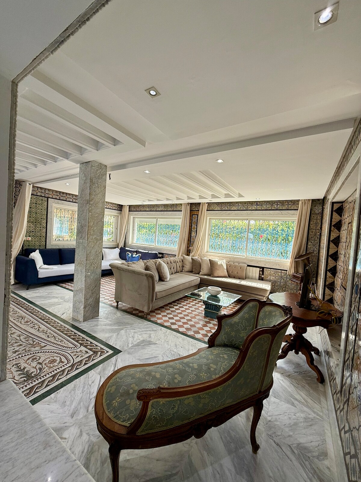 Un hébergement raffiné, parfait pour 1 à 2 voyageurs. Profitez d'une chambre confortable, 2 salons lumineux et une cuisine équipée. Le jardin privé offre un espace détente. La décoration mêle élégance et charme tunisien avec des carreaux traditionnels et un mobilier raffiné. A proximité des commerces, du Carrefour, des plages et du club de tennis de La Marsa. Vous serez tout près des vestiges historiques de Carthage, ainsi que des collines de Gammarth et du charmant village de Sidi Bou Saïd.