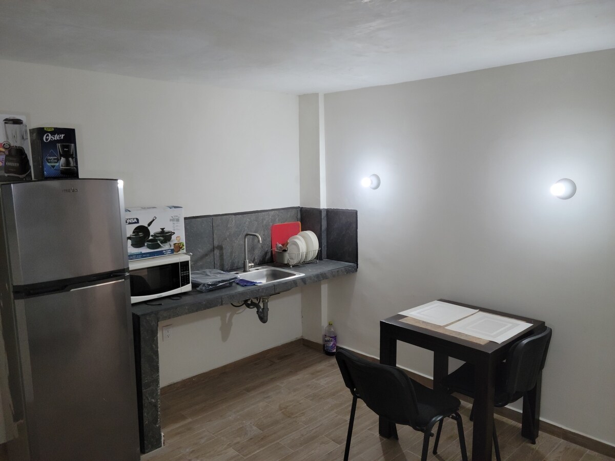 Nuevo departamento minimalista con todo lo que un viajero o familia necesita para pasar una cómoda noche, nos encontramos en una buena ubicación ya que alado de nosotros se encuentra una parada de autobús, así como enfrente del departamento se encuentra una tienda Oxxo, también a 3 minutos en coche se encuentra Soriana y nos ubicamos a 7 minutos en coche de los mejores restaurantes de la ciudad.