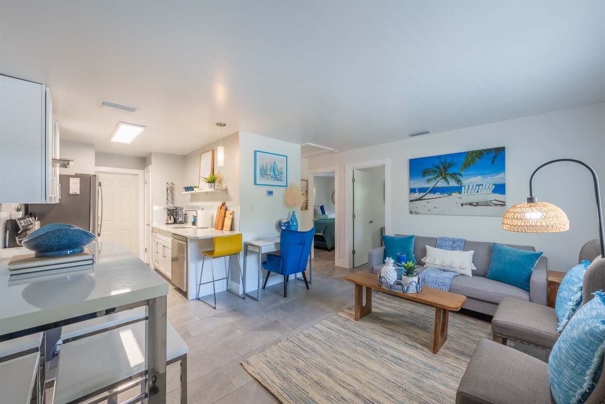 Adorable one bedroom "Old Florida Cottage" on the intracoastal bay side of Siesta Key. This is a stand alone cottage, ground floor, no elevators or flights of stairs to mess with. New Pool with a tiki hut, fishing dock, boat basin (up to 24'), beach access 4 min. walk across Midnight Pass Rd. to the #1 beach with the whitest, softest sand you'll ever see! Hi Def TV in LR , Wifi, TV in BR, Keurig in the kitchen, stocked with everything but your clothes and toothbrush.