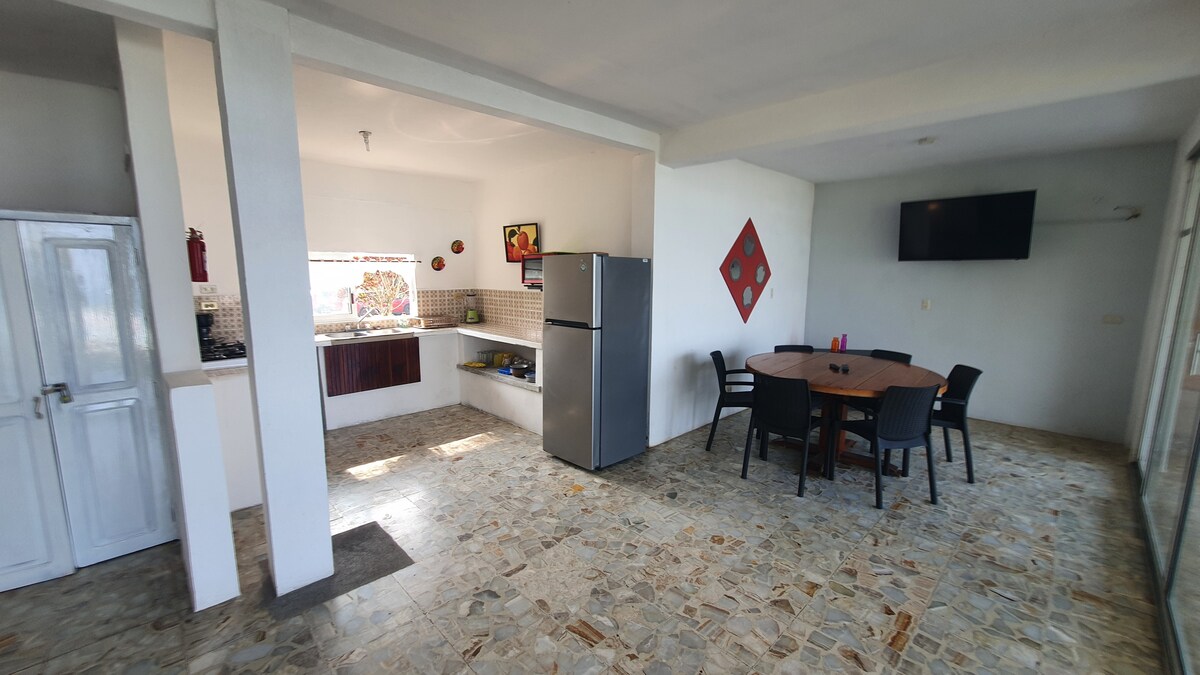 🌊 **¡Descubre Tecolutla, Veracruz! A tan sólo 5 minutos de la playa** 🌊 Te presentamos un espacioso alojamiento compuesto por dos departamentos que se rentan juntos, ideales para familias o grupos grandes. Con un total de **4 recámaras** perfectamente equipadas: 🛏 **Detalles de las recámaras**: 1. Recámara con dos camas matrimoniales y aire acondicionado. 2. Recámara con cama queen, aire acondicionado y una cuna que puede convertirse en cama individual para una persona. 3. Recámara con cama queen y aire acondicionado. 4. Recámara con dos camas matrimoniales y aire acondicionado. 🛁 **Comodidades**: - Dos baños completos con agua caliente, para asegurar la comodidad de todos los huéspedes. - Cocina completamente equipada con cafetera, refrigerador, microondas, trastes básicos, garrafón de agua y cocineta. - Espacios acogedores de convivencia con una salita sencilla y comedor en cada departamento. 🌴 **Área Común** 🌴: - Alberca de 4x3 metros con 1.40 metros de profundidad, perfecta para refrescarse. - Chapoteadero, diversión garantizada para los más pequeños. - Palapa con vista panorámica al río, ideal para relajarte y disfrutar del entorno. - Estacionamiento seguro con capacidad para un auto. Experimenta lo mejor de Tecolutla, Veracruz, con la ventaja de estar cerca de la playa. ¡Aguardamos tu visita! 🌅🏝