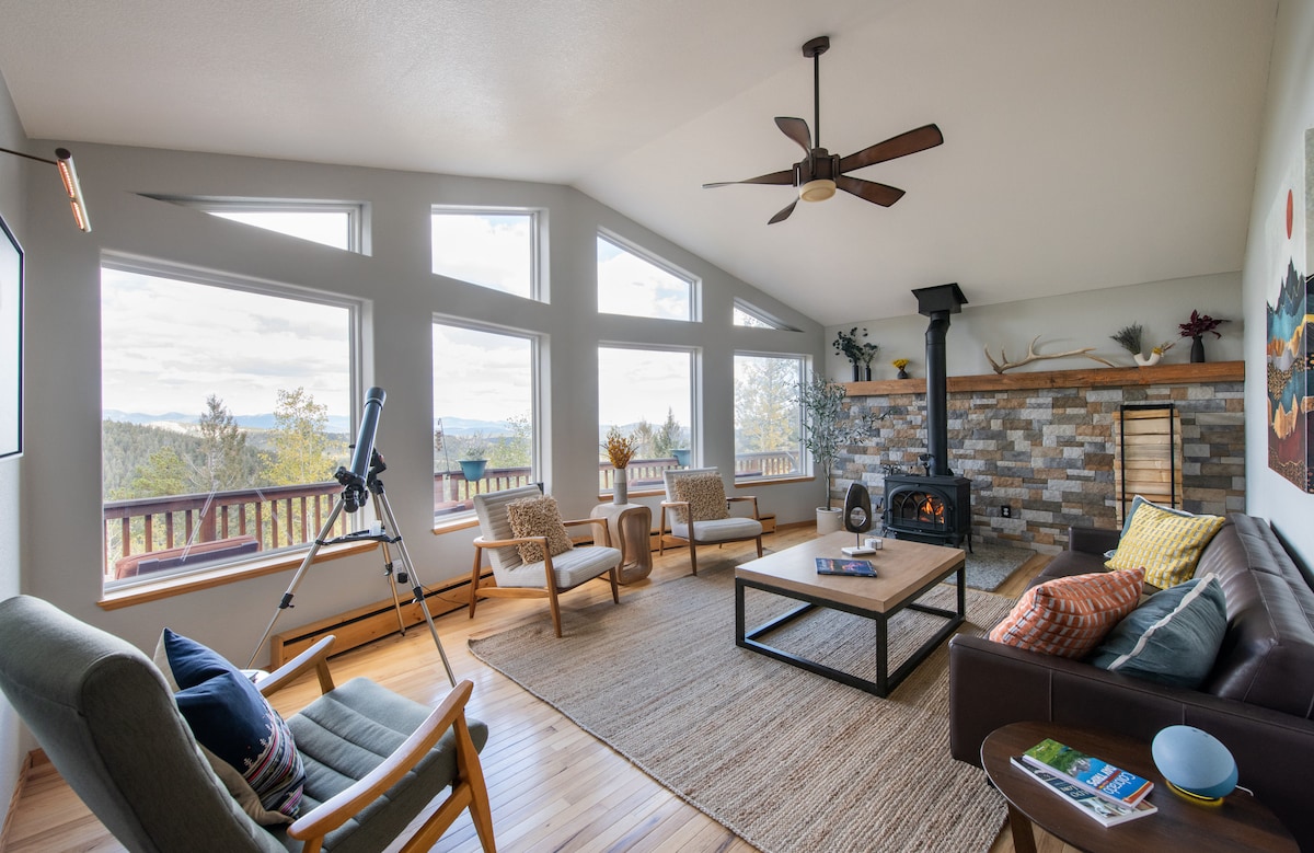 Escápate a un gran refugio privado en la montaña en 9,4 acres encaramados en la cima de la montaña Conifer. Esta casa recién renovada ofrece impresionantes vistas despejadas. Disfruta de lujosas comodidades que incluyen jacuzzi, sauna de barril, campo privado de lanzamiento de hachas, chimeneas interiores y exteriores, sala de cine con TV de pantalla plana gigante de 85 pulgadas, sala de juegos y bicicleta Peloton+. Perfecto para familias y grupos que buscan una escapada única de primera calidad en Colorado con acceso rápido a Red Rocks, Evergreen, Denver y lugares para bodas.