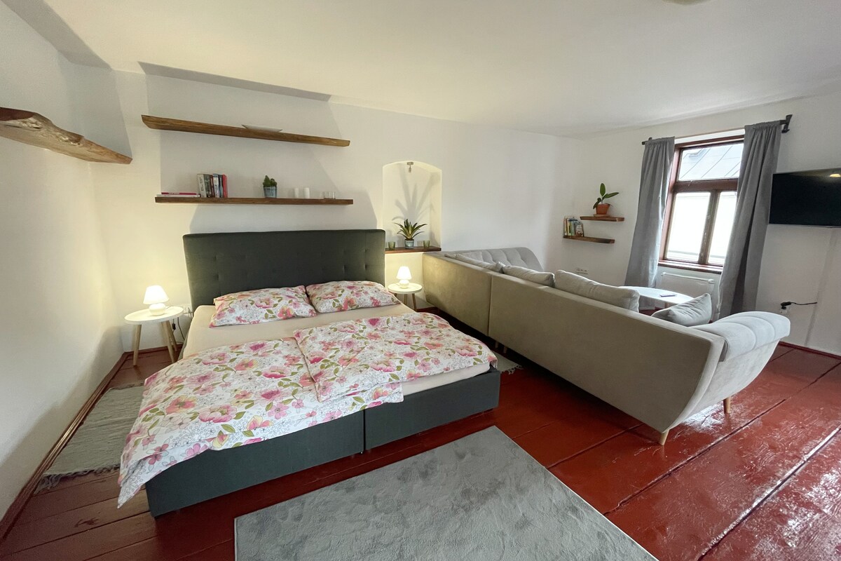 Apartamento soleado de un dormitorio con cocina pequeña, baño privado e inodoro. La casa construida alrededor de 1830 sobre los cimientos de la puerta medieval de la ciudad en el camino "Svatá Anna" desde Čelkovice, está justo debajo de las paredes en la ladera sur sobre el valle del río Luzhnice, a 2 minutos caminando de la plaza principal. Servicios del baño: bañera grande y ducha. Estacionamiento público a 30 metros de la casa (precio desde 40,- CZK/día). Entrada con teclado (el código se enviará por SMS) = llegada autónoma. Tabor (¡no Praga!)