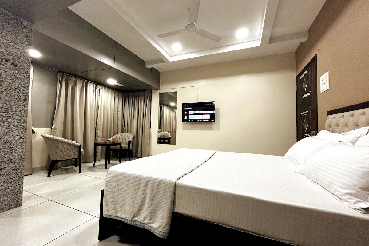 Queremos proporcionarte una estancia cómoda y relajante. Permítenos darte una descripción clara de lo que ofrece nuestra suite. El salón está diseñado para relajarse, con cómodos sofás y cojines en contrastes de colores afilados. Es luminoso y soleado, lo que lo convierte en un gran lugar para trabajar o leer. También puedes disfrutar del entretenimiento en el televisor de pantalla plana. Las vistas de la ventana son magníficas y ofrecen unas vistas espectaculares de la ciudad de Navi Mumbai, de día o de noche.
