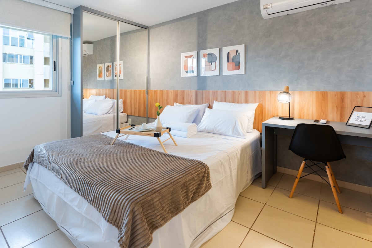 Relájate en este espacio completo, bien ubicado y moderno ACERCA DE LA PROPIEDAD 01 Dormitorio (suite) - A 850 METROS de la estación de metro. - Supermercado y gimnasio las 24 horas en el apartamento. - Espacio cubierto en el garaje - Capacidad para 3 personas (tercera en el sofá cama). - Fácil acceso a través de Virtual Portaria. LO MÁS DESTACABLE - Cama tamaño queen. Wifi (350 MB) - Televisión inteligente de 43 pulgadas. - Aire acondicionado - Mesa Home Office. - Cerradura electrónica (acceso con contraseña) - Lavadora de ropa + tanque - Estufa de gas - Juego completo de electrodomésticos y utensilios.