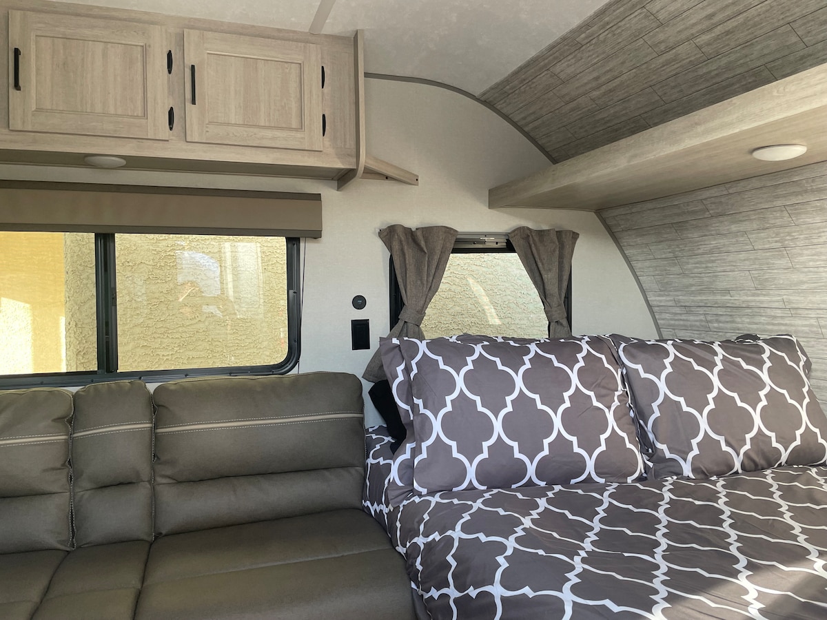 RV/Camper con pequeño patio. Tiene una cama tamaño queen, una pequeña litera como una cama y un sofá cama. Cerca de la autopista 10; a 2 minutos a pie de la ESTACIÓN TESLA Supercharger. Tiene una ubicación ideal a solo 15 millas del centro de Los Ángeles, a 20 millas de Disneyland, a 26 millas de Universal Studios, a 34 millas de LAX y a 25 millas del aeropuerto de Ontario. Pasadena está a solo 11 millas de distancia. La zona ofrece una variedad de restaurantes y tiendas de comestibles cercanos, por lo que es una base perfecta para tu estancia.
