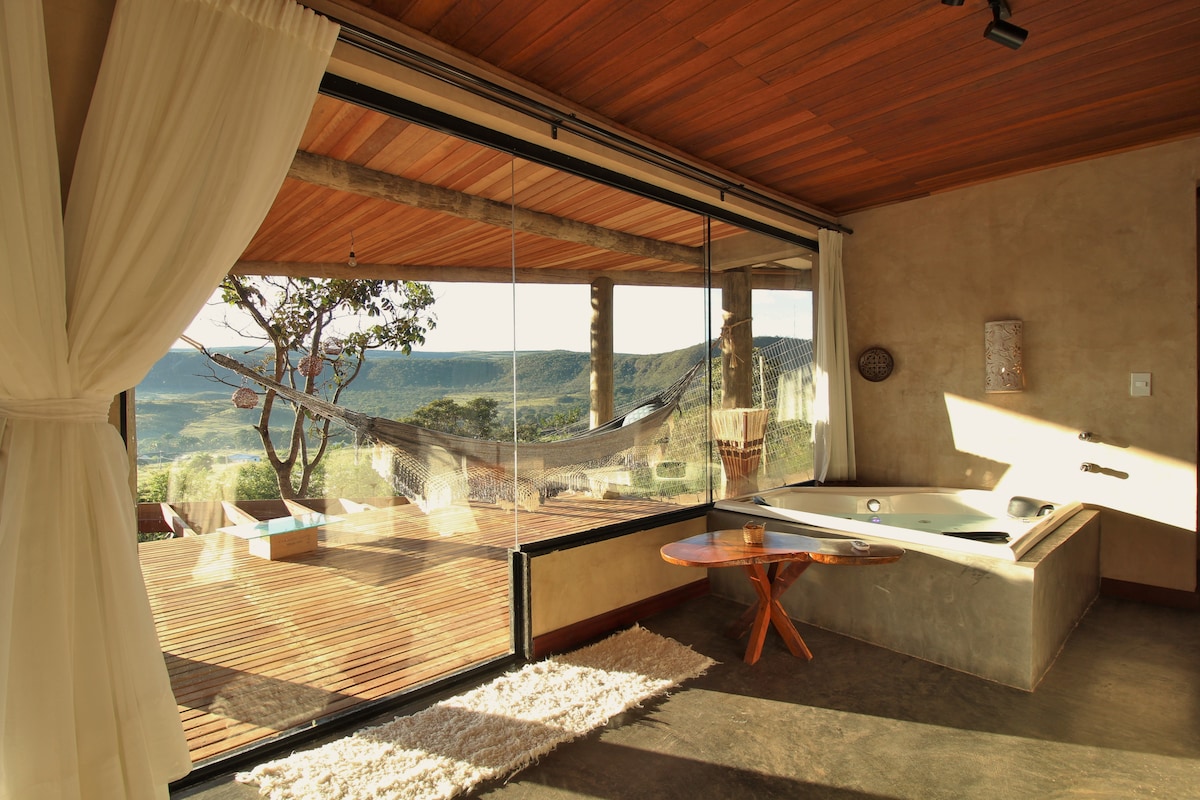 La cabaña Atrium es un refugio romántico con una vista cinematográfica de las montañas de Chapada dos Veadeiros. Desde el hidro o el balcón, admira la Serra da Boa Vista y la inolvidable puesta de sol. A pocos minutos del Parque Nacional y de las principales cascadas, el Átria es el lugar perfecto para relajarse y vivir la magia de Chapada. Aquí, el tiempo se ralentiza. El sol sale entre las montañas, el silencio es profundo y las noches están bañadas por un cielo estrellado, una invitación a experimentar la Chapada de una manera única