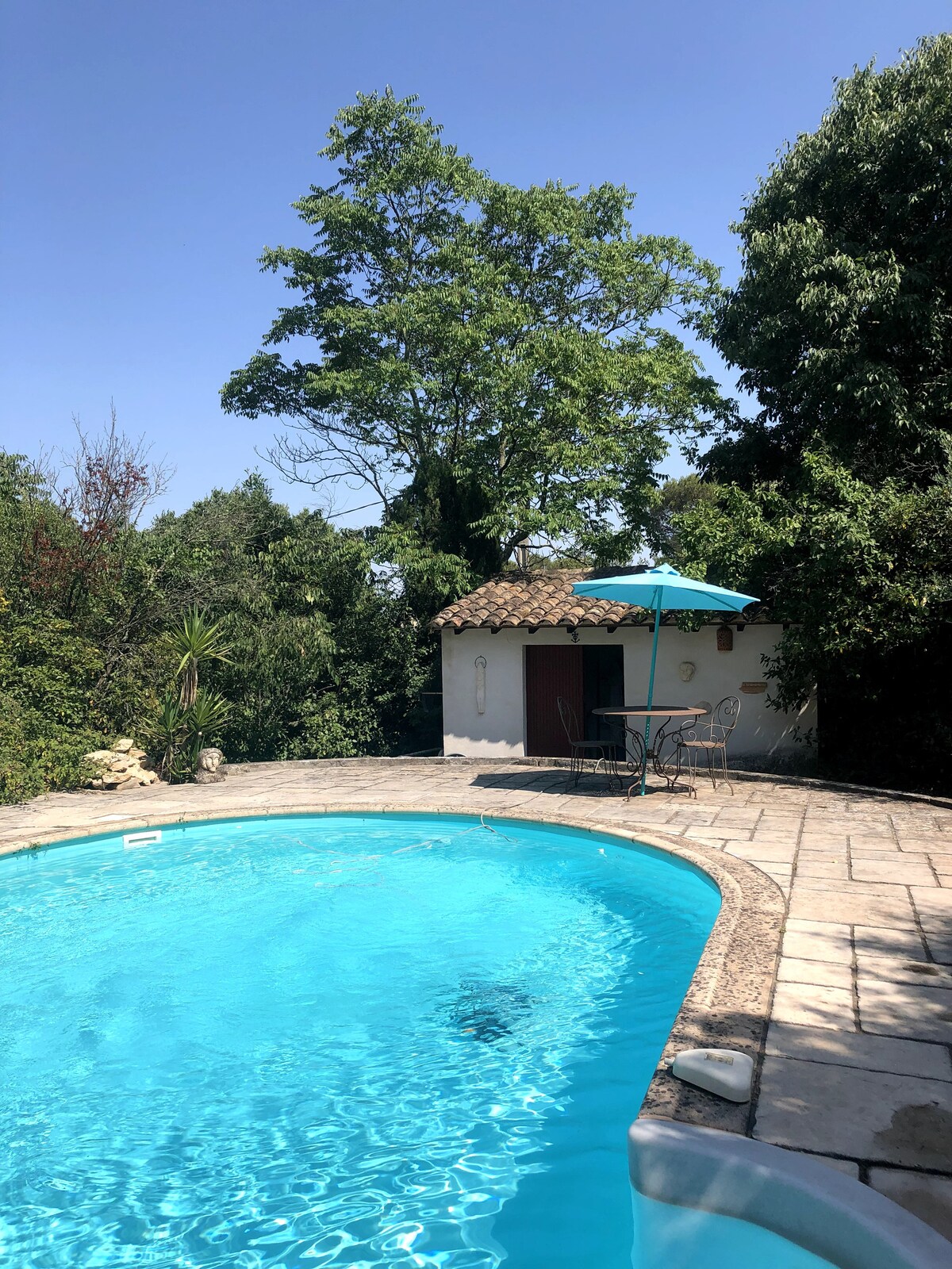 Une expérience en Garrigue nîmoise (disponible à la location de mai à septembre seulement), au calme, tout en étant proche du centre de la ville de Nîmes (moins de 2 km de ses Jardins de la Fontaine), riche de son passé romain... Vous serez bercés par le chant des oiseaux ou réveillés par le chant des cigales. Vous pourrez vous rafraîchir ou vous reposer au bord de la piscine. Vous pourrez disposer d'un espace de repos ombragé, pour une petite sieste ou une partie de pétanque.