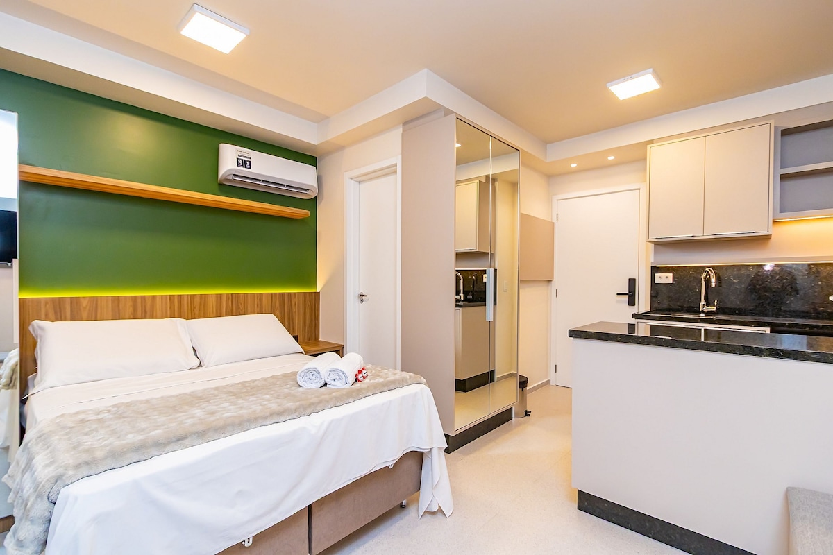 Estudio de diseño exclusivo y de alto estándar lleno de estilo, centrado en la mejor experiencia en AirBnB, junto al centro comercial Estação. Gagarem no incluido. Cocina completa equipada con nevera, cocina, microondas, TV Smart 42", Cama Box Premium estándar de hotel, súper ducha y wifi. Red de protección en las ventanas y sofá cama muy cómodo. En el deseado Condominio LifeSpace, nuevo y con gimnasio, piscina cubierta y climatizada, espacio para SPA con sauna húmeda y seca además de hidromasaje. ¡Inolvidable!