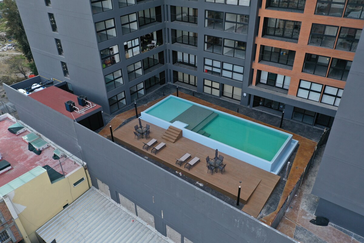 -Un Penthouse con una vista y ubicación privilegiada. Cerca del centro Histórico de Guadalajara y de fácil acceso con estacionamiento privado. -Cuenta con Terraza y Jacuzzi privado al aire libre. -Además contamos con alberca de uso común en el mismo nivel. -Ubicado en el nivel 9 a un costado del elevador en una torre de apartamentos exclusivos, con cómodas instalaciones y acogedores ambientes diseñados para que vivas una experiencia increíble! Será un gusto poder recibirte con nosotros.