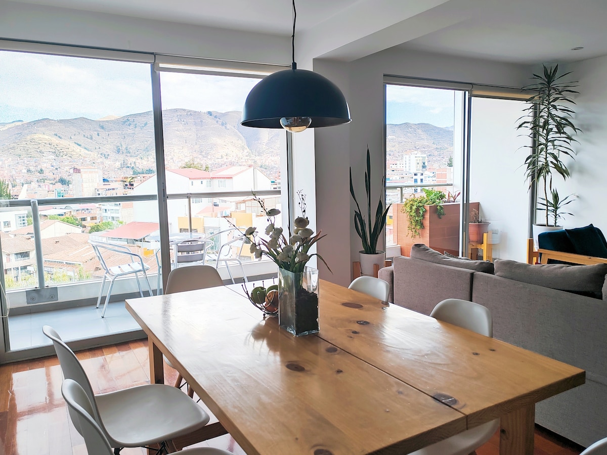 El apartamento se ubica en una zona céntrica de Cusco, donde podrás encontrar muy cerca supermercados, restaurantes, farmacias, entidades bancarias y financieras, casas de cambio, clínicas de salud y otros, decoración moderna sencilla, funcional, acogedor y bien iluminado. Sala con biblioteca, Wifi, Netflix, Cable mágico, sofás confortables, moderna cocina y comedor totalmente equipado, duchas con abundante agua caliente las 24 horas, terraza con sombrilla y vista panorámica de la ciudad.