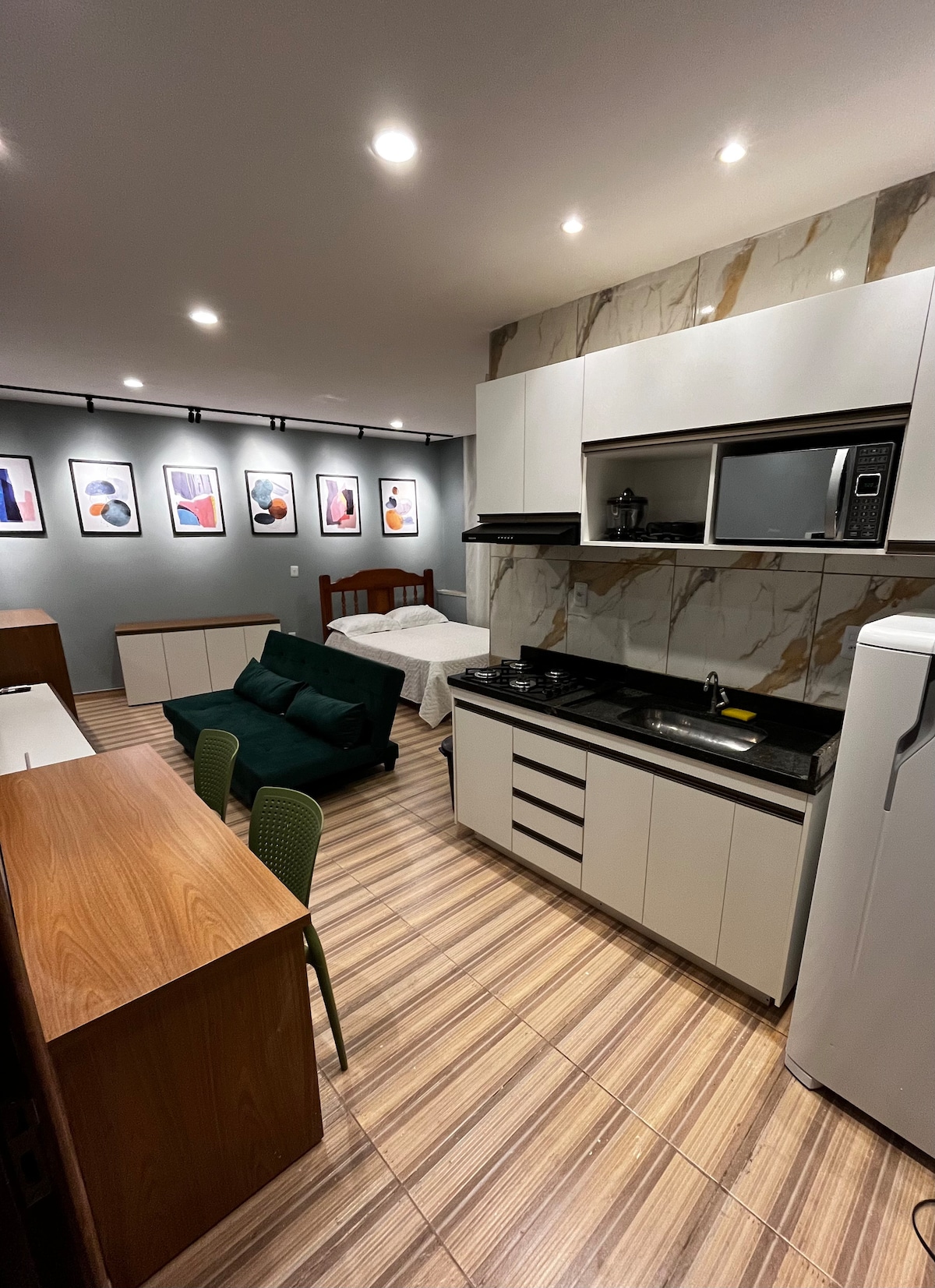 Espacio compacto y funcional ideal para dos personas. Vcs dormirá en una cama de tamaño queen con colchón ortopédico, sábanas de algodón, aire acondicionado dividido, cortinas opacas, TV inteligente de 43 pulgadas, wifi, DVD y una mini cocina con minibar, cafetera, hervidor de agua eléctrico, filtro de agua, vajilla y cubiertos. Para alojarse en nuestro apartamento, solo aceptamos un mínimo de dos noches.