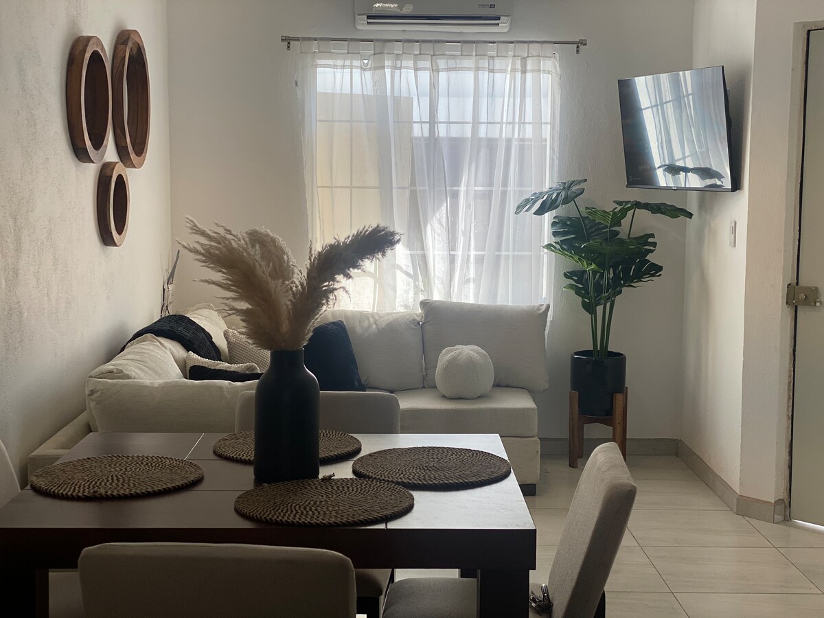 Tómate un descanso y relájate en este espacio agradable que tenemos para ti!! en unas de las zonas más seguras & tranquilas de la cuidad a menos de 20 minutos de la playa 🏖️ ; cuenta con 2 recámaras, 3 aires acondicionado para que no sufras de calor , Wifi 🛜 Netflix cochera techada! Bien cabe un auto pequeño.