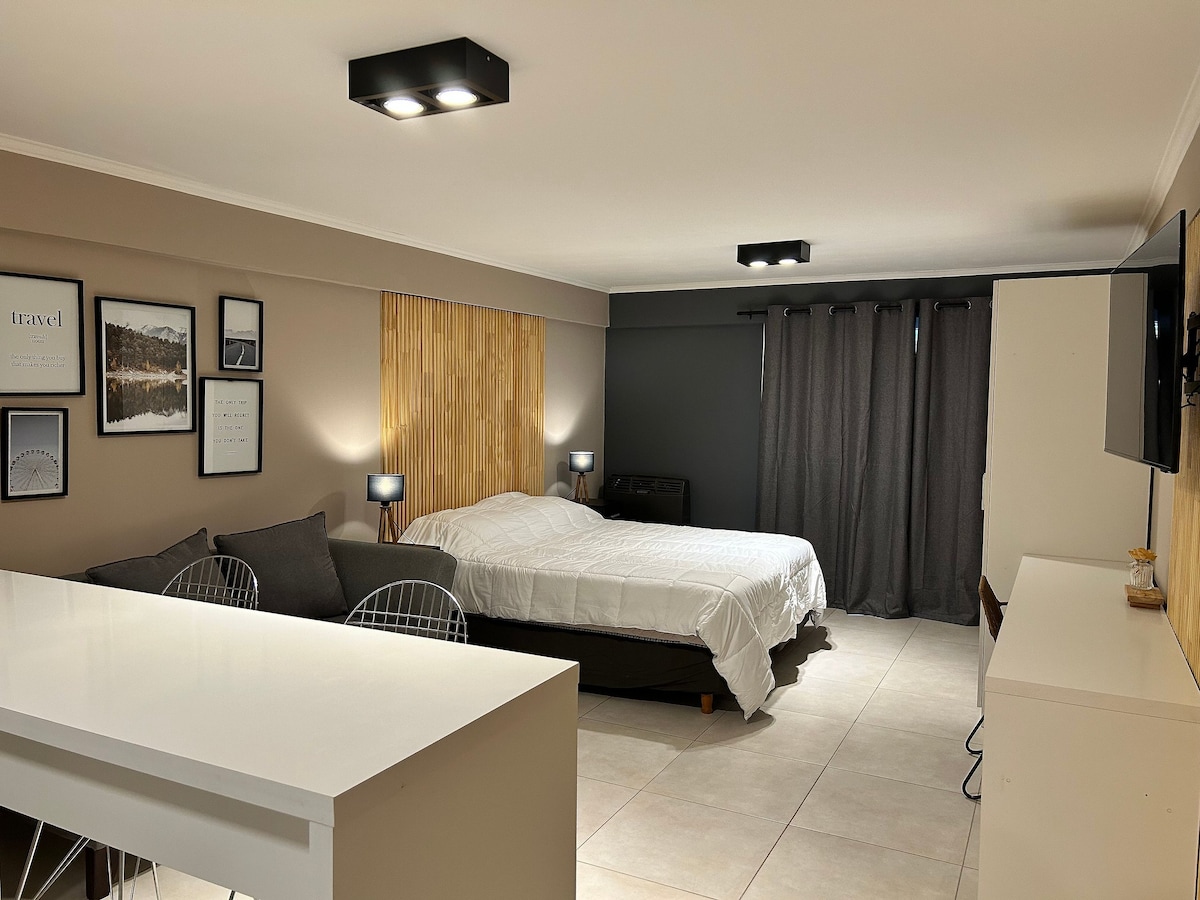 Monoambiente moderno y a estrenar, ideal para hasta 2 personas, diseñado para ofrecer confort, funcionalidad y estilo. El espacio integra una TV de gran tamaño, sofá cómodo y cocina completa, totalmente equipada para una estadía práctica. Cuenta además con mesa de escritorio, ideal para home office. Ubicado en el primer piso, con balcón, y en pleno centro, combina diseño contemporáneo, comodidad y una ubicación privilegiada.
