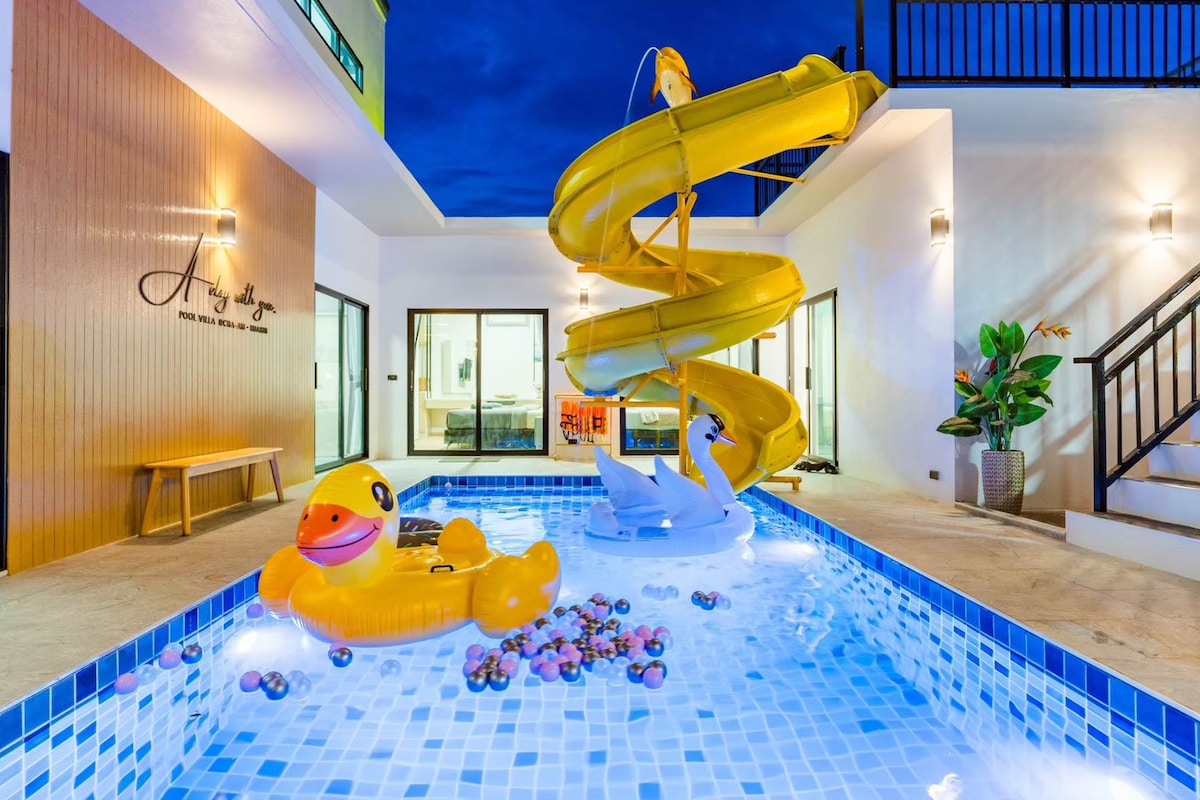 • A 5 minutos de la playa de Cha-am. • A 3 minutos del supermercado, 7-11 • A 3 minutos del restaurante Krau Mueuk Hom. • Piscina de agua salada y hundida • Tobogán en espiral de 16 m • Chalecos salvavidas para niños • Bañera al aire libre en la azotea. • Televisión inteligente de 65 pulgadas • Wifi de 1000 Mbps. • Refrigerador 13 Q • Utensilios de cocina completos /Tostadora /Hervidor eléctrico /Arrocera /Microondas /Parrilla eléctrica /Parrilla para barbacoa • Cubo de hielo y enfriador. - Toallas • Calentadores de agua • Secadores de pelo en todas las habitaciones. •Gel de ducha y champú • Cepillos de dientes, pasta de dientes y ducha