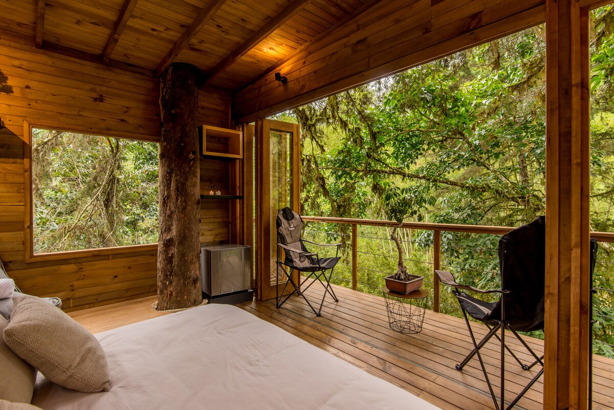 A dos horas de Bogotá por la vía Bogotá- Sasaima vive la experiencia única de hospedarte en un árbol a ocho metros de altura. Despiértate con el silbido de los pájaros y acuéstate con el sonido de la quebrada que pasa por debajo. Disfruta una suite cinco estrellas con todas las comodidades en las ramas de los árboles. La cabaña cuenta con agua caliente, mini nevera y la vista más espectacular. ¡Delicioso desayuno incluido!