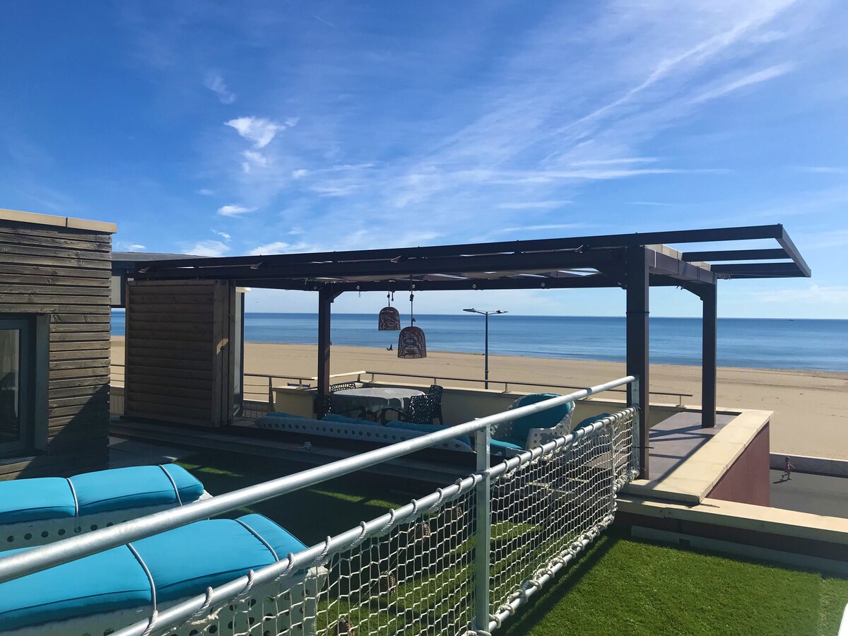En primera línea, la playa de arena fina y el mar Mediterráneo a tus pies. Un piso de 100 m2 totalmente equipado y con aire acondicionado con una plaza de aparcamiento privado (con posibilidad de aparcar dos coches). Mélanie te dará la bienvenida y te guiará. Una cocina ultramoderna con terraza, solárium y vistas de 360°. Entre el mar y el Clape, tómate tu tiempo para descansar y disfrutar de la belleza que te ofrece la naturaleza.