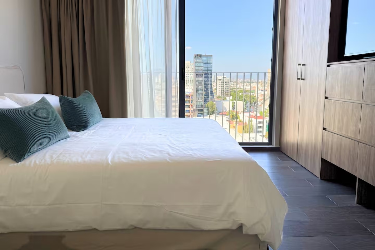 - Piscina de natación en el piso 22. - Hermoso gimnasio con vistas a la ciudad. - Totalmente equipado para estancias largas. - Estacionamiento disponible (con costo adicional) - Servicio de limpieza: una vez a la semana para reservas de más de 7 noches. Ya sea que viaje por trabajo o por placer, disfrutarás de este moderno estudio en una nueva torre de lujo en el barrio de Providencia, cerca del centro comercial Midtown Jalisco.