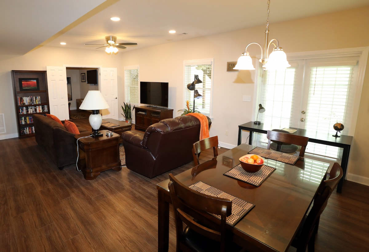 Unwind & re-charge at "Lake Escape," a very comfortable private one-bedroom apartment only a block from Lake Allatoona with private dock and swimming. Dog-friendly, bright downstairs suite with many windows, separate entrance, fully equipped kitchen, spacious living area, full bath, fire pit, hammock, two patios and fenced yard. Enjoy lake life near fine dining, shopping & historic downtown Woodstock, in a secluded golf cart community near a public beach, boat ramps & marina with boat rental.