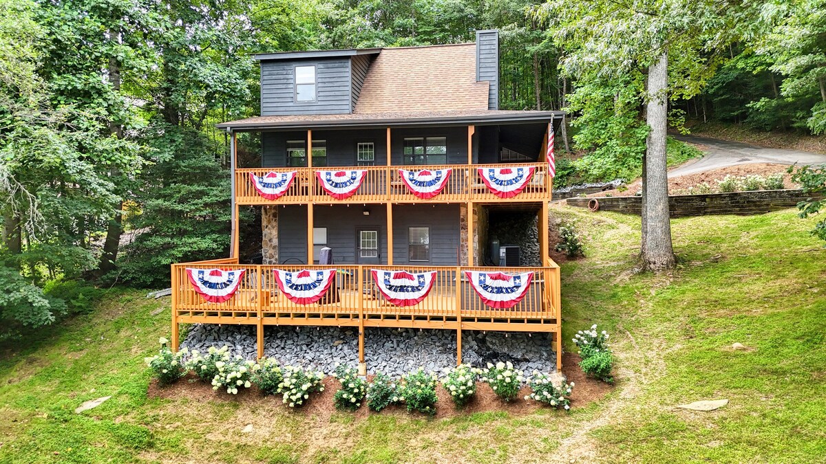 Esta casa de montaña de nueva construcción está escondida en un barrio tranquilo que limita con el Bosque Nacional Nantahala, pero a solo diez minutos en coche del centro de Franklin. Disfruta de mañanas tranquilas en la cubierta envolvente mientras contemplas las hermosas vistas a la montaña. Pasa tus días haciendo senderismo, montando en bicicleta o pescando con mosca en los numerosos senderos y ríos cercanos. Luego, termina tu día de forma perfecta en el jacuzzi o alrededor de un fuego crepitante mientras contemplas la puesta de sol.