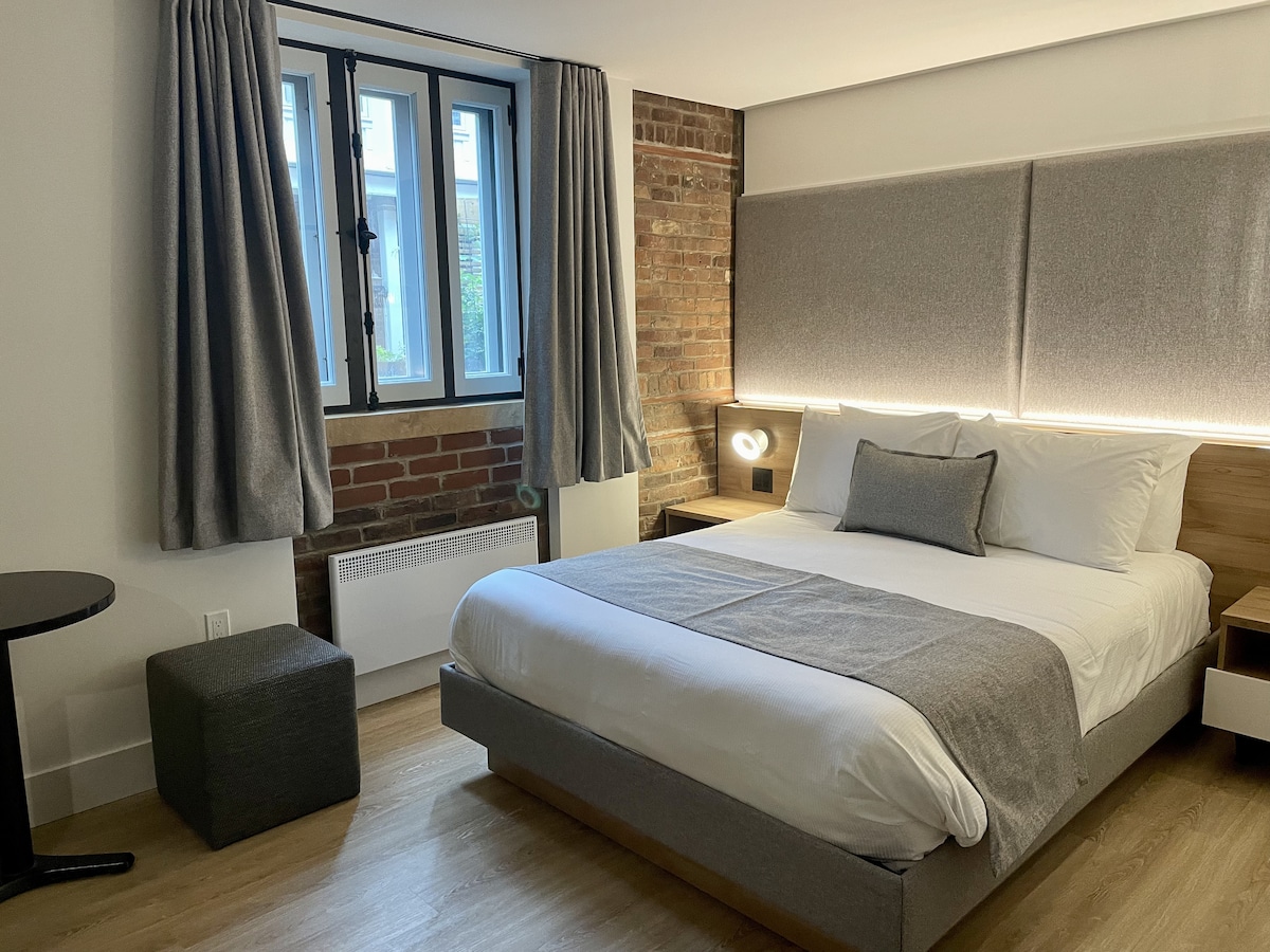 *Esta categoría de habitación combina varias habitaciones similares. La habitación reservada puede diferir ligeramente de las imágenes que se muestran* Esta espaciosa y bellamente decorada suite ofrece una acogedora sala de estar, perfecta para los momentos de familiares o amigos. Con una cama tamaño king y un sofá cama, incluye una cocina totalmente equipada con todo lo esencial (microondas, estufa, cafetera). Con su elegante estilo urbano, este alojamiento ofrece un verdadero refugio en el corazón del histórico Quebec.