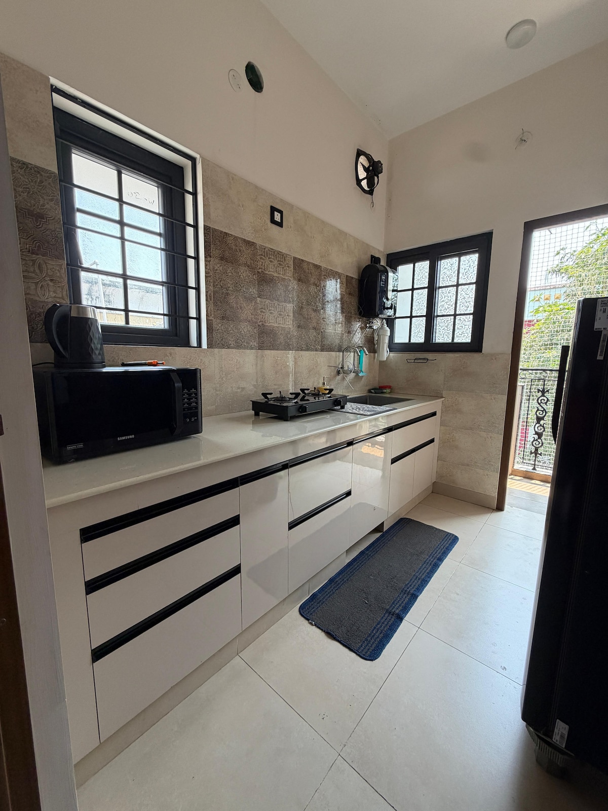 This approx. 210 sq.ft. studio is ideal for a young working couple or a single adult who is not looking to cook lavishly, for e.g. make their daily cuppa, some light breakfast and an even lighter dinner. There's a spacious fridge available inside the room. This home is about 12 m away from the building gate and situated at the NW corner of the parking lot. It's independent with a biometric enabled lock to enable self check-in.