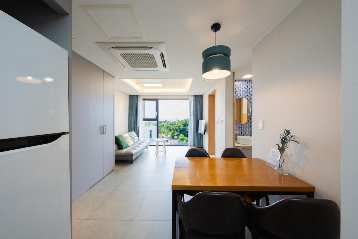 Hola. Ubicado sobre un acantilado en el centro de Seogwipo, este espacio ofrece vistas al océano y a las islas. Con 66㎡ garantiza privacidad y tiempo propio. Aunque es tipo estudio, el dormitorio, sala y cocina están claramente separados, brindando amplitud y comodidad. En la terraza podrá disfrutar del spa y de una barbacoa con vista al mar. Desayune frente al mar en la piscina infinita a diario. La piscina abre de mayo a octubre. El lounge ofrece desayuno gratuito con vistas a Beomseom.:)