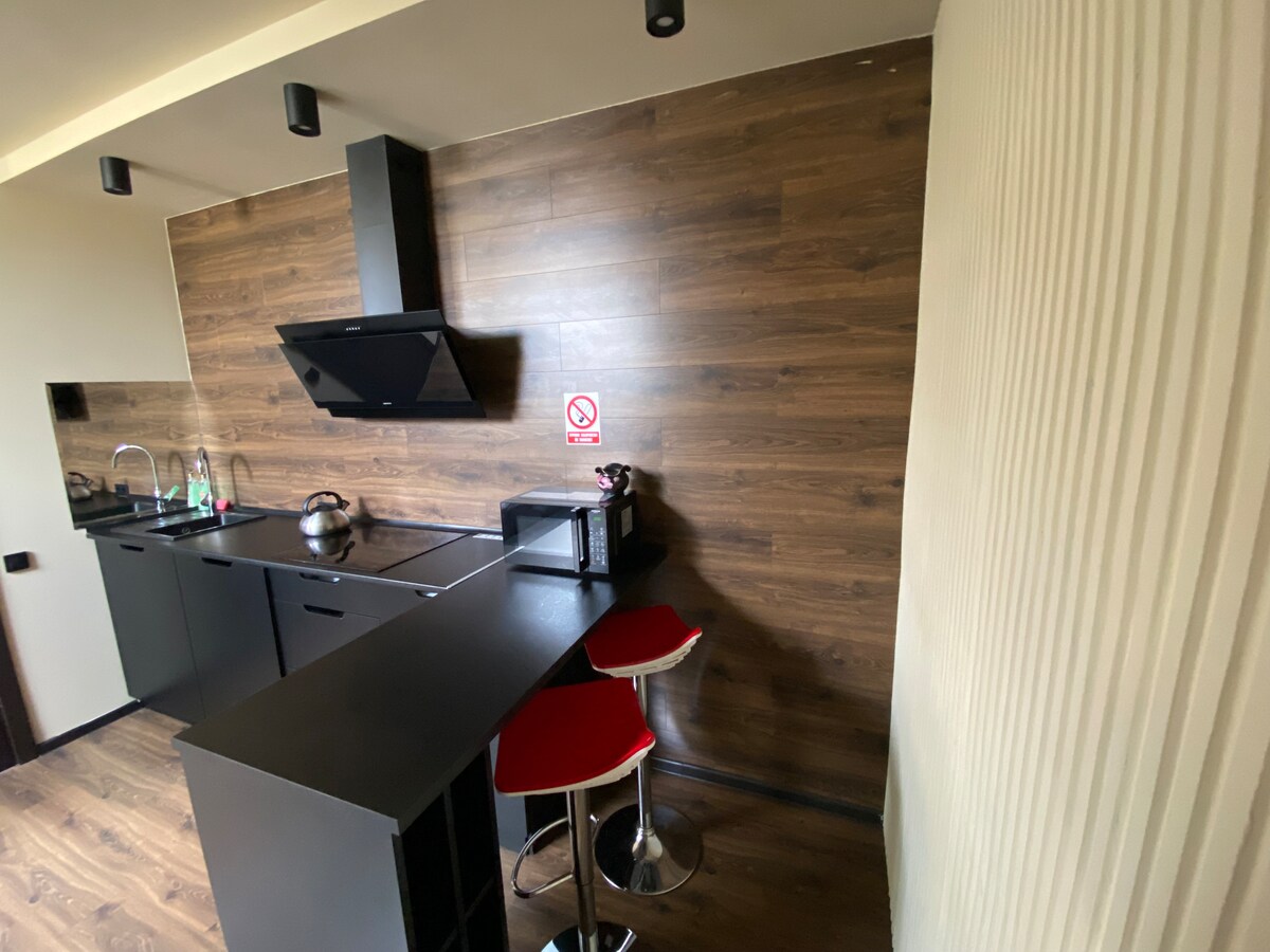 Departamento en alquiler con dos camas separadas. El apartamento tiene TV de pantalla plana, wifi gratuito y baño con ducha. La cocina está equipada con una estufa eléctrica, hervidor eléctrico, nevera y utensilios necesarios. La distancia al centro de la ciudad es de 2,6 km, a la estación de autobuses a 3 km, a la estación de tren a 4 km, al aeropuerto a 3 km. El centro médico sueco-ucraniano ANGELHOLM está a 300 metros del departamento.