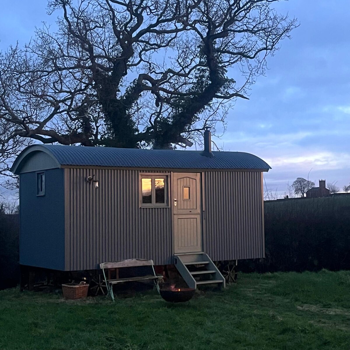 Una cabaña de pastor única construida a mano, rodeada de la campiña de Shropshire, con unas vistas inmejorables a la puesta de sol por la noche Desconéctate, relájate y sumérgete en la naturaleza, encuentra inspiración y conexión profunda y disfruta de noches estrelladas con el relajante sonido de los búhos Tawny... Pasa tus días dando paseos desde la puerta por los carriles rurales y disfruta de las noches cocinando en la cocina al aire libre y relajándote junto a la fogata...o acurrúcate adentro con un buen libro junto a la estufa de leña.
