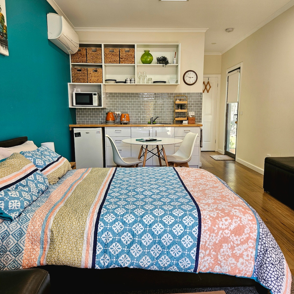 Nuestra casa de huéspedes tiene capacidad para 1 a 4 personas. Nota: **El segundo dormitorio solo está disponible al reservar para más de 2 personas** Los dormitorios tienen una cama tamaño queen, ropa de cama de calidad, edredones de lana y mantas eléctricas. Nuestra sala de estar de planta abierta está decorada con buen gusto con sillones de cuero, TV, reproductor de DVD, calentador de leña Coonara, aire acondicionado y cocina bien equipada con cafetera Nespresso. Baño moderno. Zona de terraza al aire libre. Se pueden alojar niños adicionales previa solicitud.