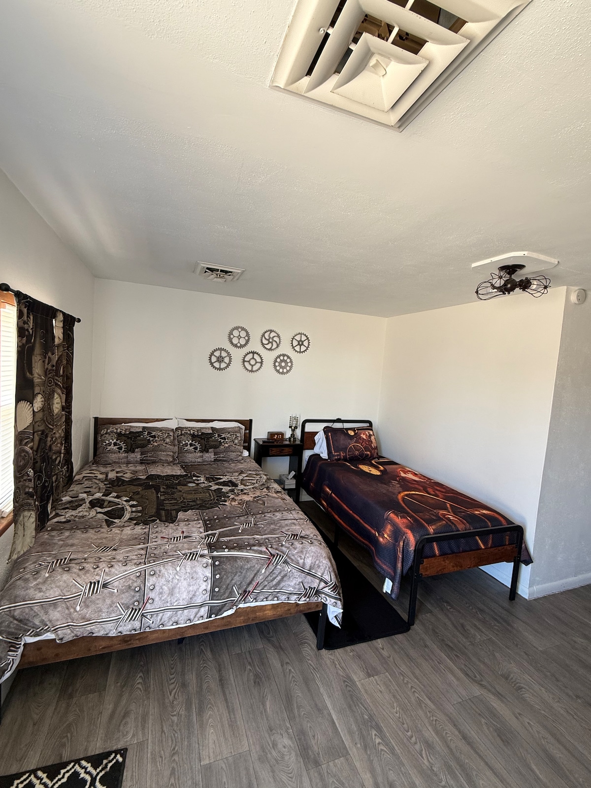 Te damos la bienvenida a la habitación Steampunk en el Hwy 36 Hideaway, ¡ahora bajo nueva propiedad! ¡Esta acogedora habitación es donde la comodidad simple se encuentra con el encanto inesperado! Esta habitación es una encantadora habitación individual de estilo motel ubicada en el motel de piedra caliza de los años 40 recientemente remodelado, anteriormente el motel Wright. Está temático en honor al Tri State Thresher Show que se celebra cada julio en Bird City. Cuenta con 1 cama tamaño queen, 1 cama individual XL, 1 sofá cama, 1 baño, microondas, mininevera, TV y cafetera.