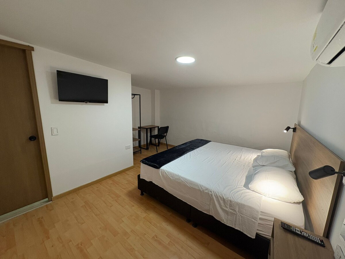 ¡Descubre el lujo y la comodidad en nuestras suites en el exclusivo Barrio El Prado, Bucaramanga! A solo una cuadra de la Carrera 33, tendrás acceso inmediato a transporte, deliciosos restaurantes, vibrantes bares, centros comerciales, supermercados, parques cercanos y fácil acceso a vías principales. Habitación dotada con: - Somier Queen 1.60m ancho - TV Led pulgadas - Sofa cama y Puff - Aire acondicionado - Internet y TV Satelitál
