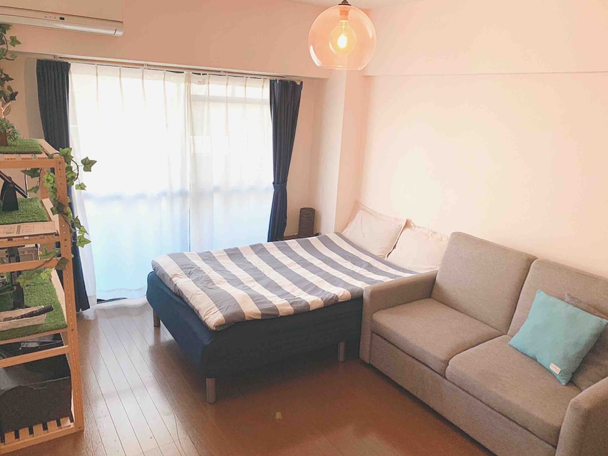 A 5 minutos a pie de la estación de Tenjin de Fukuoka. Habitación de apartamento remodelada. Una cama doble y un sofá cama.